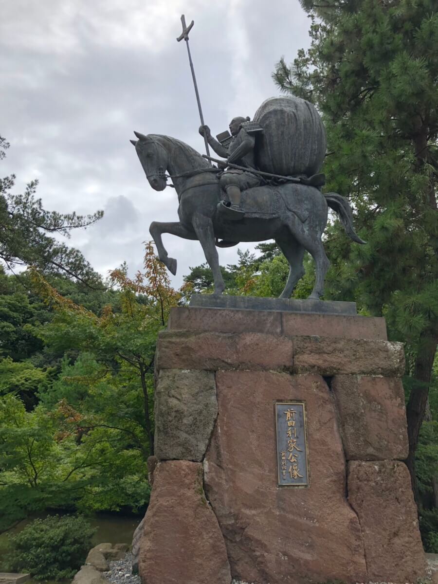 境内に入って右手に回ると母衣をまとった赤母衣衆時代の前田利家公の像があります。