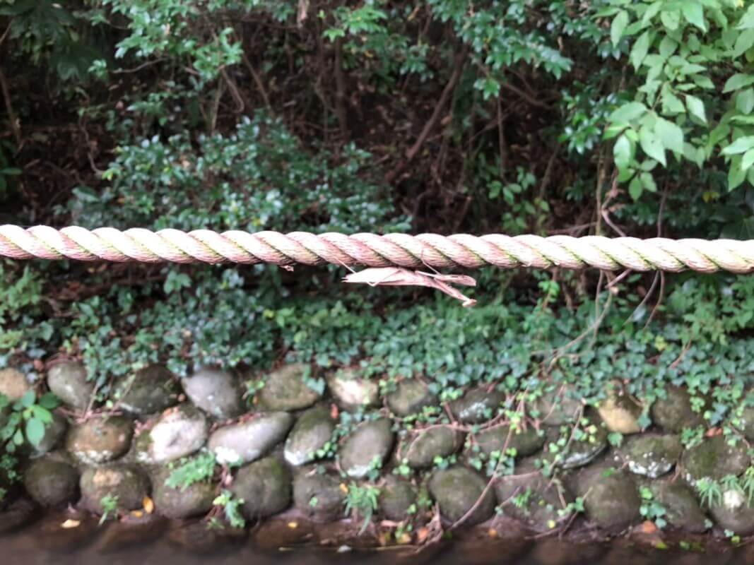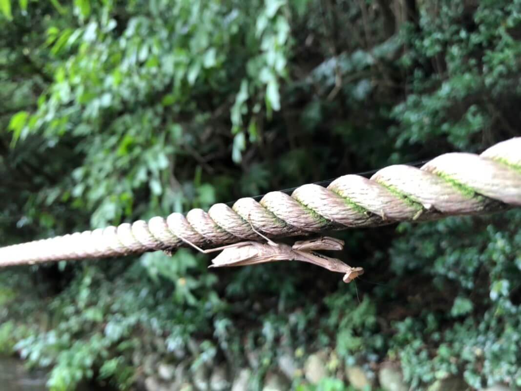途中ふと脇に目をやるとロープに擬態したカマキリが留まっていました。