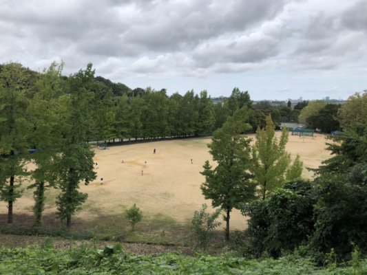 道を下ると広々とした野球場のグラウンドがあり子供達が元気に練習しています。