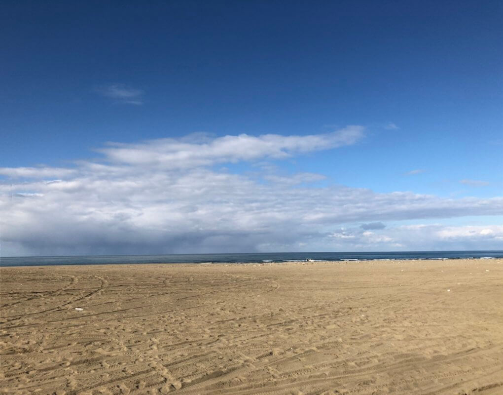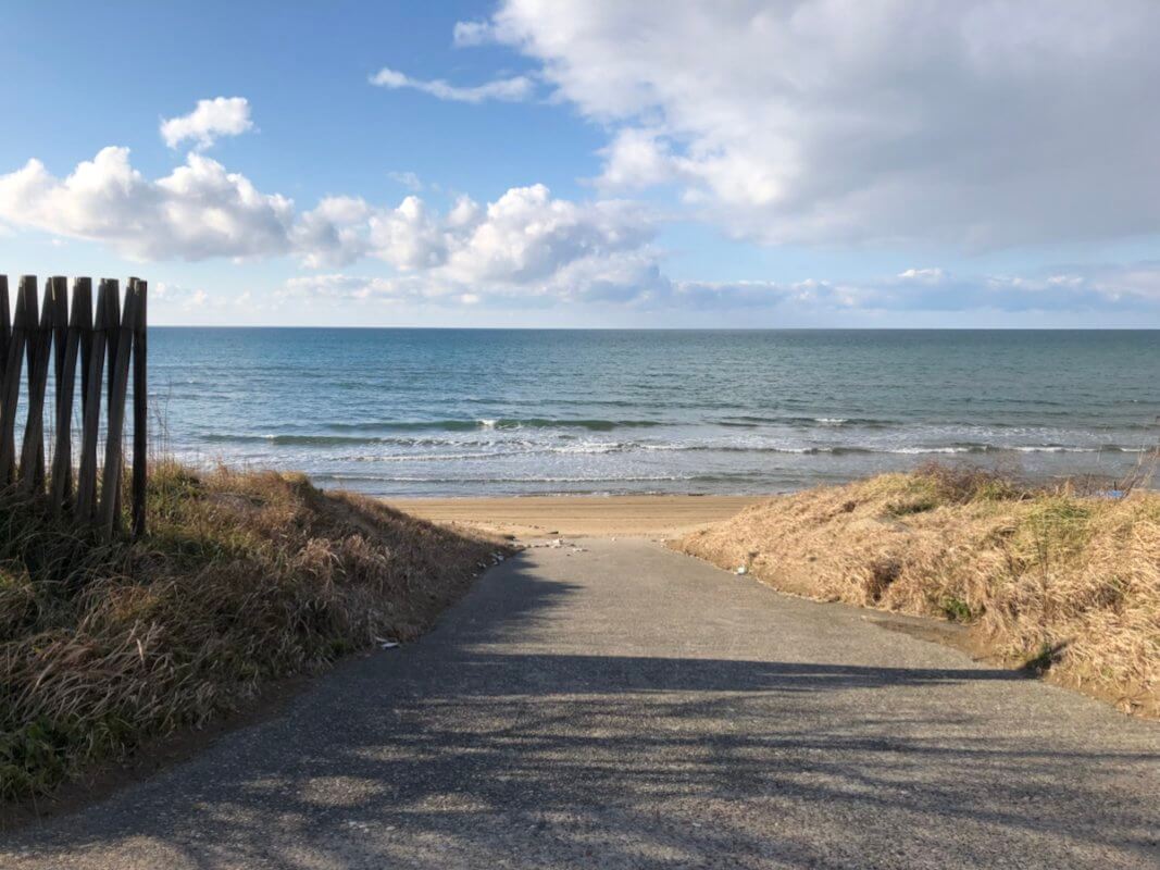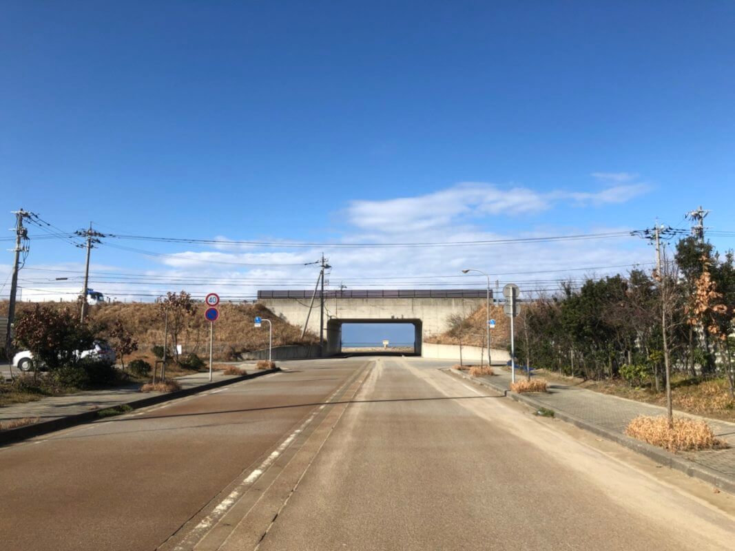 内灘駅から真っ直ぐに伸びた道を10分程歩くと、ついに内灘海岸の入り口が見えてきました。