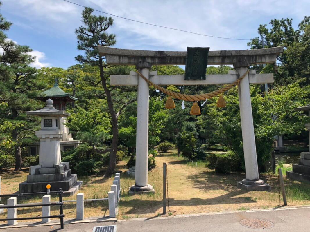 まっすぐ道を歩いて行くと最初の大きな交差点の右手に大きな鳥居が見えます。
